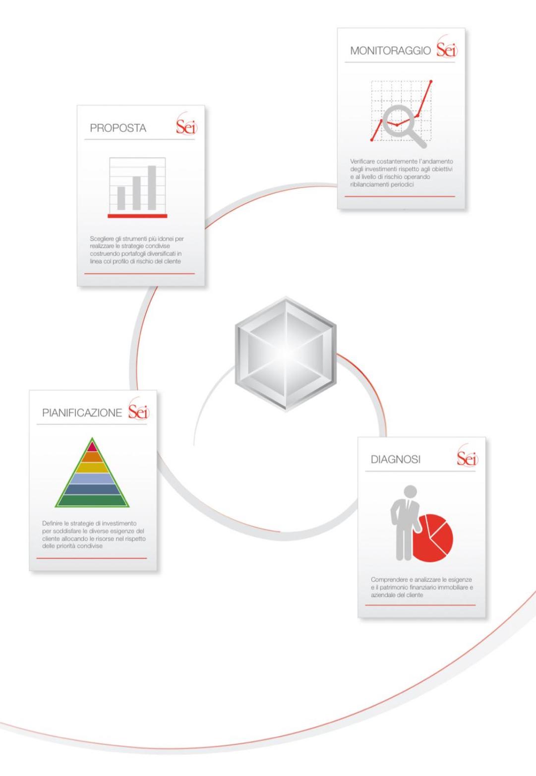 Perseguire i tuoi obiettivi è un processo continuo che richiede valutazioni periodiche e attenzione costante. Il Servizio di Consulenza Sei applica un approccio «circolare», continuo e strutturato in 4 fasi. In questo modo, siamo in grado di seguire, passo dopo passo, l’evolversi della tua vita e aggiornare i tuoi piani di investimento al mutare del contesto e delle tue esigenze.